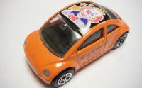 | yellow, turquoise VW logo on sides, painted lights, BUGOUT 2000 |