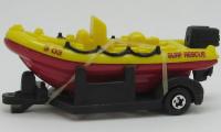 Raft Boat| yellow, red, black motor, SURF RESCUE, black trailer |