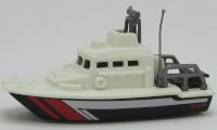 Beach Patrol (Boat)| white deck, black hull, gray railings, red and silver stripes |