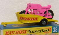 Honda Motorcycle and Trailer| pink cycle, light yellow trailer, HONDA labels |