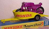 Honda Motorcycle and Trailer| metallic purple cycle, light yellow trailer, HONDA labels |
