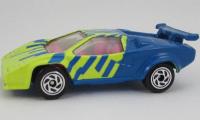 Lamborghini Countach| fluorescent yellow and blue, blue design on hood, roof and sides |