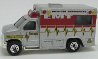 Ford Ambulance| silver-gray, MEDICAL TRANSPORT / EMT with red band and yellow lines | | silver-gray, MEDICAL TRANSPORT / EMT with red band and yellow lines, MB2000 on left rear side window |
