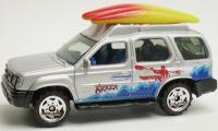 Nissan Xterra| silver-gray, yellow and red kayaks, kayaking scene |