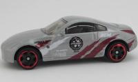 Nissan Z| silver-gray, maroon and white design with logos |
