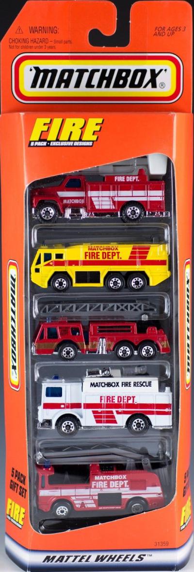 red, MATCHBOX FIRE DEPT. and gold stripe