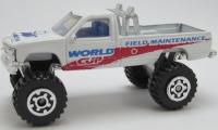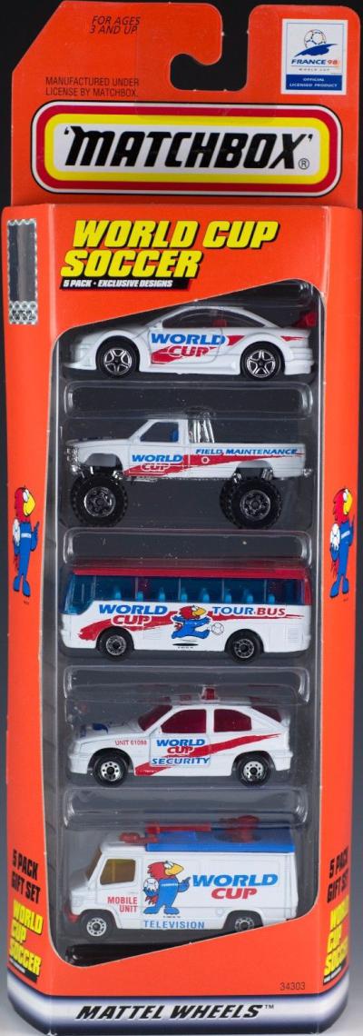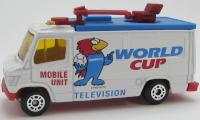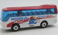 white, red roof, blue and red WORLD CUP TOUR BUS