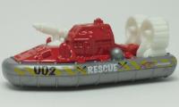 Hovercraft| red deck, gray hull, white airfoils, RESCUE 002 with yellow stripies |