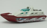 Body: dark metallic red hull, white deck, SEA EXPLORER tampo