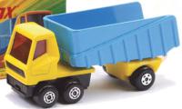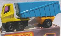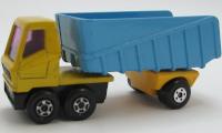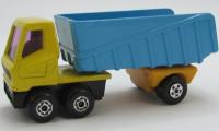 Body: yellow cab, black cab base, orange-yellow trailer base, trailer rear casting type with license, no hole, no ridge, blue dump, no labels