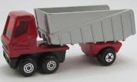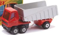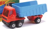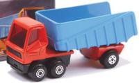 Body: orange-yellow cab, black cab base, orange-yellow trailer base, trailer rear casting type with license, no hole, no ridge, blue dump, no labels