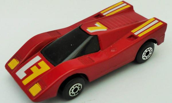 maroon, L and reversed F on hood, 7 on roof, yellow and white stripes |