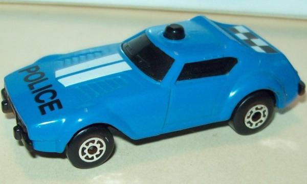 blue, black roof light, POLICE, black and white stripes and checkers |