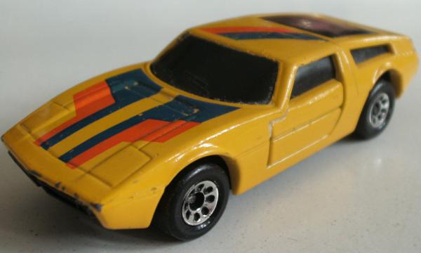 yellow, orange and navy blue stripes on roof, flag shapes on hood |