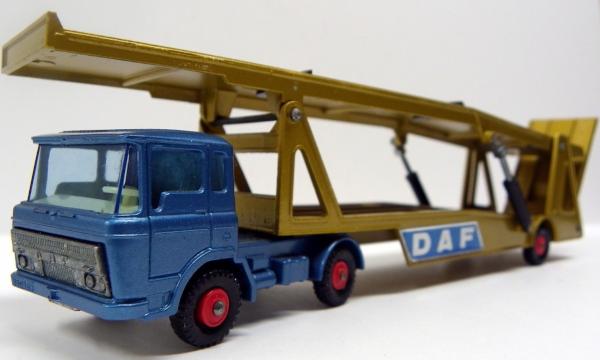 metallic blue cab, gold trailer, black wheel blocks, DAF labels |