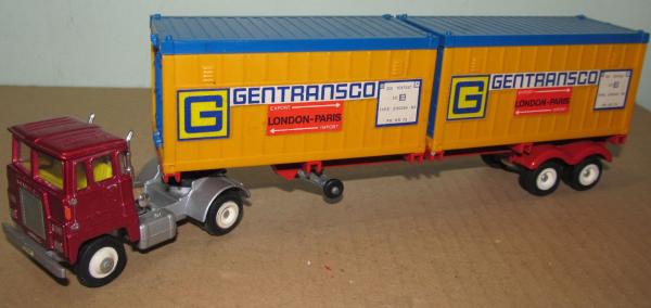 metallic red cab, red trailer chassis, orange containers, blue container roofs, GENTRANSCO labels |