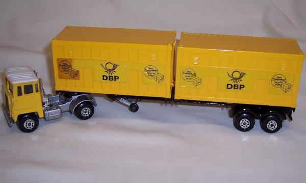 yellow cab, black trailer chassis, yellow containers, yellow container roofs, DBP labels |