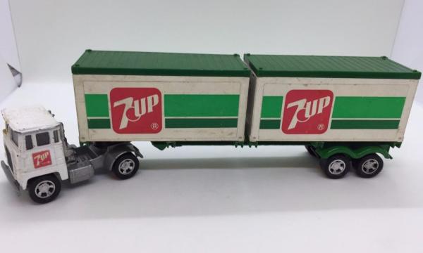 white cab, black trailer chassis, white containers, green container roofs, 7 UP labels |