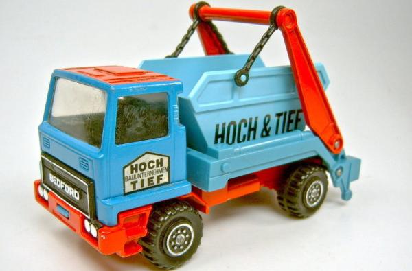 blue and red cab, light blue containers, HOCH & TIEF labels |