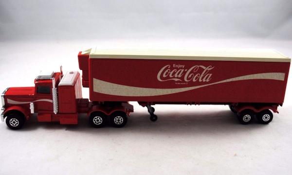 red cab, red chassis, red, white sleeper, red container, white roof, COCA COLA |