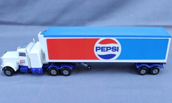 white cab, blue chassis, white, white sleeper, white container, blue roof, PEPSI COLA |