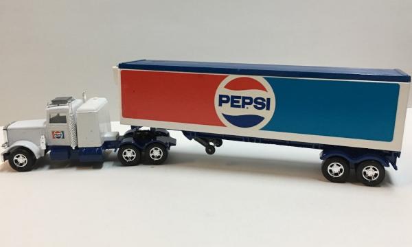 white cab, blue chassis, white, white sleeper, white container, blue roof, PEPSI COLA |