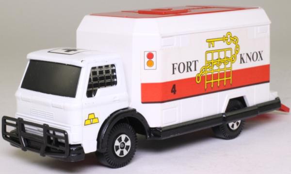 white cab, white container, red roof, FORT KNOX labels |