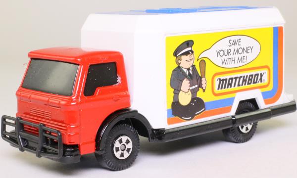 red cab, white container, blue roof, SAVE YOUR MONEY WITH ME-MATCHBOX labels |