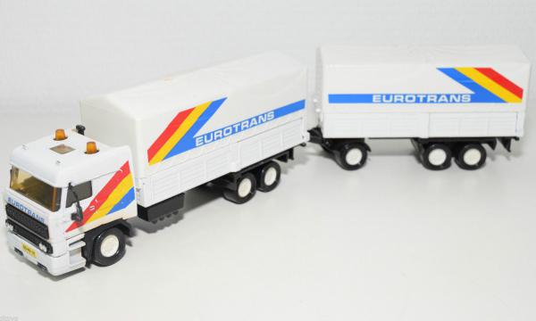 white cab, black chassis, amber dome lights, white bed, white canopies, EUROTRANS tampo |