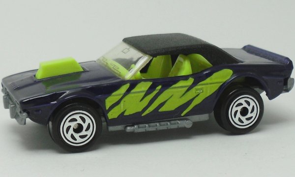 dark purple, black roof, with license plate, gray plastic bumpers and grille, neon yellow zig zags tampo |