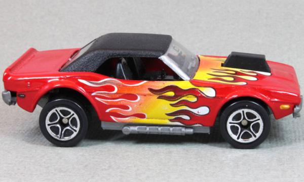 red, black roof, no license plate, gray plastic bumpers and grille, yellow and orange flames, detail trim tampo |