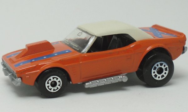 orange, white roof, with license plate, silver-gray bumpers and grille, no sides, blue stripes hood and trunk, 9 stars at rear tampo |