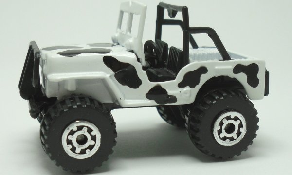 white, black bumper, shovel cast flush, black cow spots tampo |