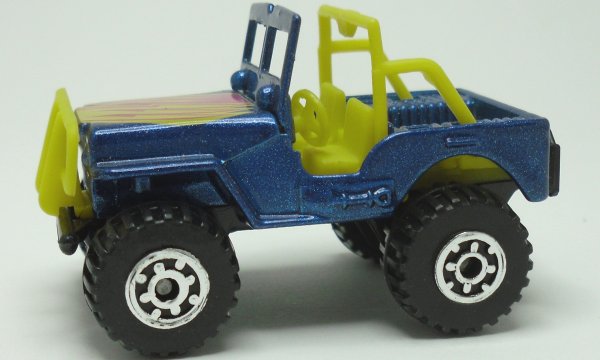 metallic blue, yellow bumper, shovel cast on raised plate, pink and yellow hood design tampo |