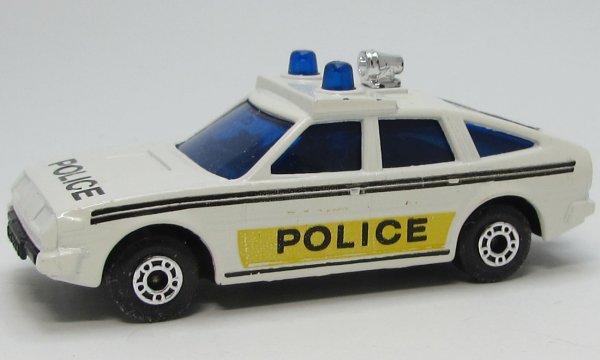 white, blue lights roof fixture, silver siren, black and yellow POLICE tampo |