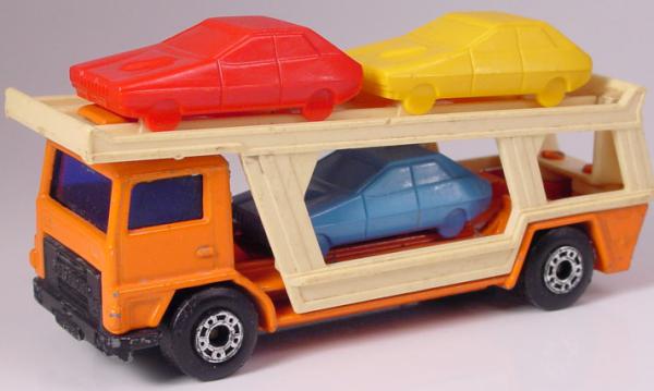 light orange, beige carrier, red / yellow / light blue cars (front, rear, bottom) |