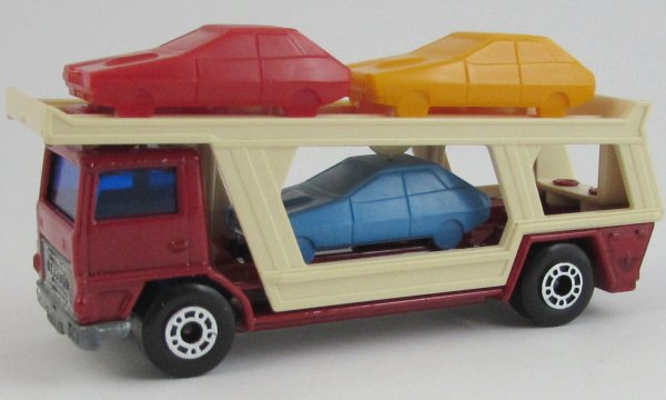 red, beige carrier, red / orange-yellow / medium blue cars (front, rear, bottom) |