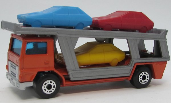 dark orange, gray carrier, blue / red / yellow cars (front, rear, bottom) |