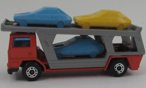 dark orange, gray carrier, light blue / yellow / light blue cars (front, rear, bottom) |