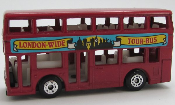 red, 4 lines on rear grille, large tail lights body casting, LONDON-WIDE TOUR-BUS deco |