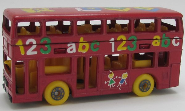 red, 4 lines on rear grille, large tail lights body casting, 123 ABC (sides), teddy bear and ABC (roof) deco |