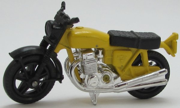 yellow, chrome engine, black handlebars, no rider, black narrow at rear seat, long front end, closed triangle on right side in front of rear wheel frame casting, no deco |