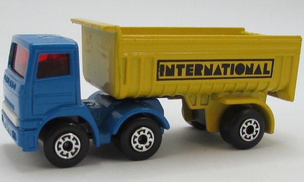 bright blue cab, yellow dump, with LEYLAND cast, with cast panel, INTERNATIONAL tampo |