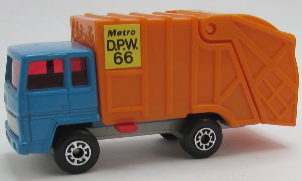 blue, orange dump, orange hatch, red trigger, with CAUTION at rear, with COLECTOMATIC at front of dump, METRO D.P.W. 66 labels deco |