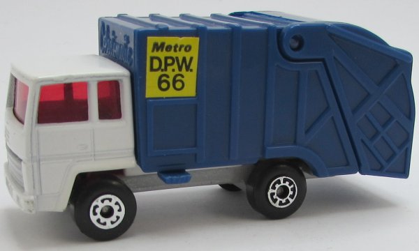 white, dark blue dump, dark blue hatch, blue trigger, with CAUTION at rear, with COLECTOMATIC at front of dump, METRO D.P.W. 66 labels deco |