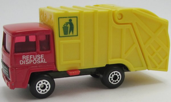 red, lemon dump, lemon hatch, red trigger, with CAUTION at rear, with COLECTOMATIC at front of dump, REFUSE DISPOSAL with caricature deco |