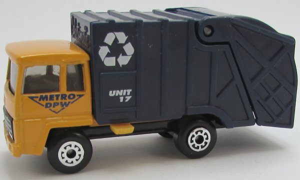 orange-yellow, navy blue dump, navy blue hatch, orange-yellow trigger, with CAUTION at rear, with COLECTOMATIC at front of dump, METRO DPW, UNIT 17 deco |