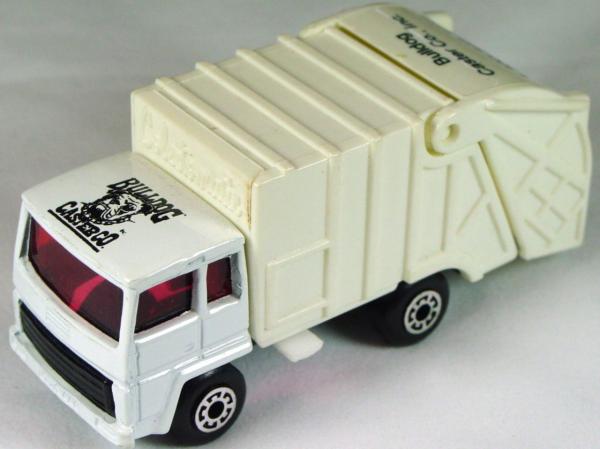 white, white dump, white hatch, white trigger, with CAUTION at rear, with COLECTOMATIC at front of dump, BULLDOG CASTER CO. (black, cab roof and hatch) deco |