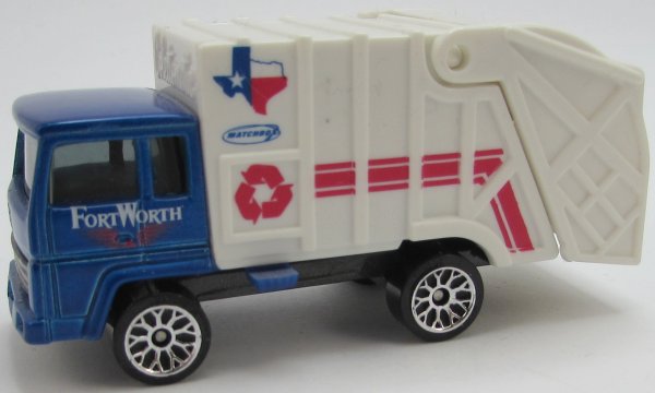 bright blue, white dump, white hatch, blue trigger, with CAUTION at rear, with COLECTOMATIC at front of dump, FORT WORTH, red design deco |