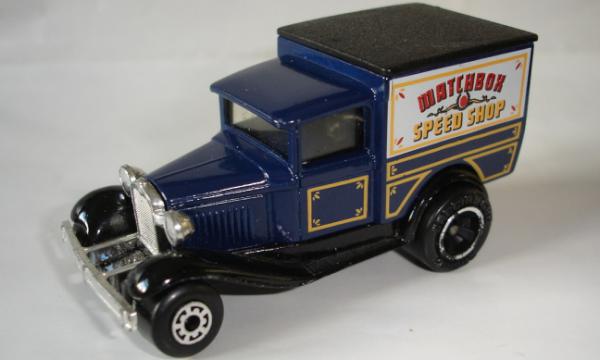 dark blue, black chassis, black textured roof, KG license plate, MATCHBOX SPEED SHOP, orange stripes deco |